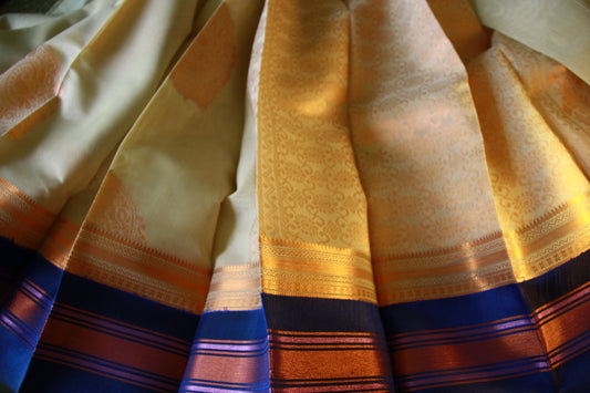 Cream Beige Cotton Saree with Deep Blue border and Light Copper work