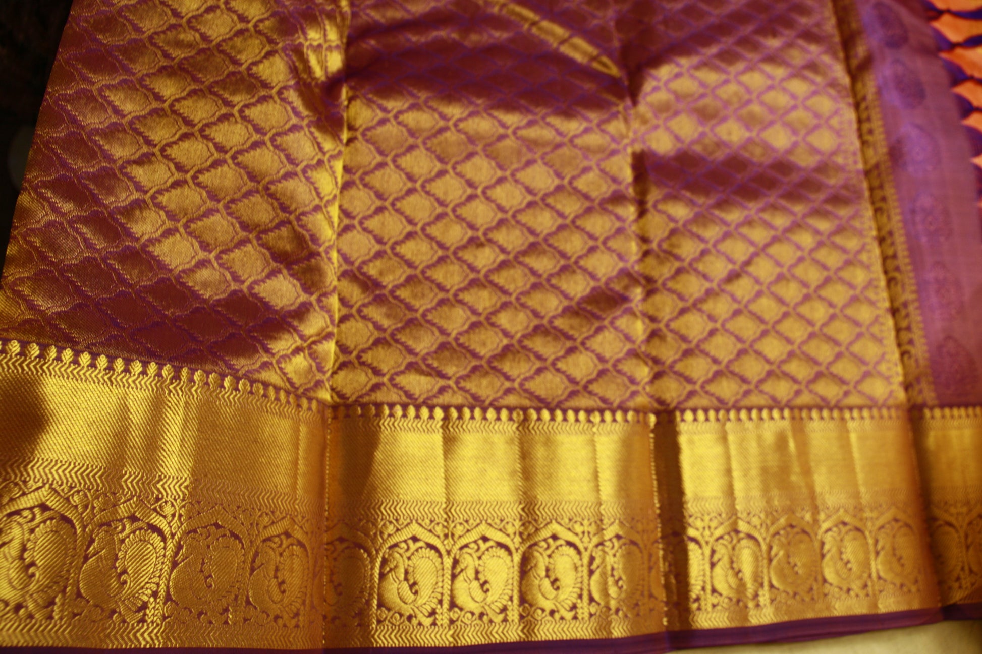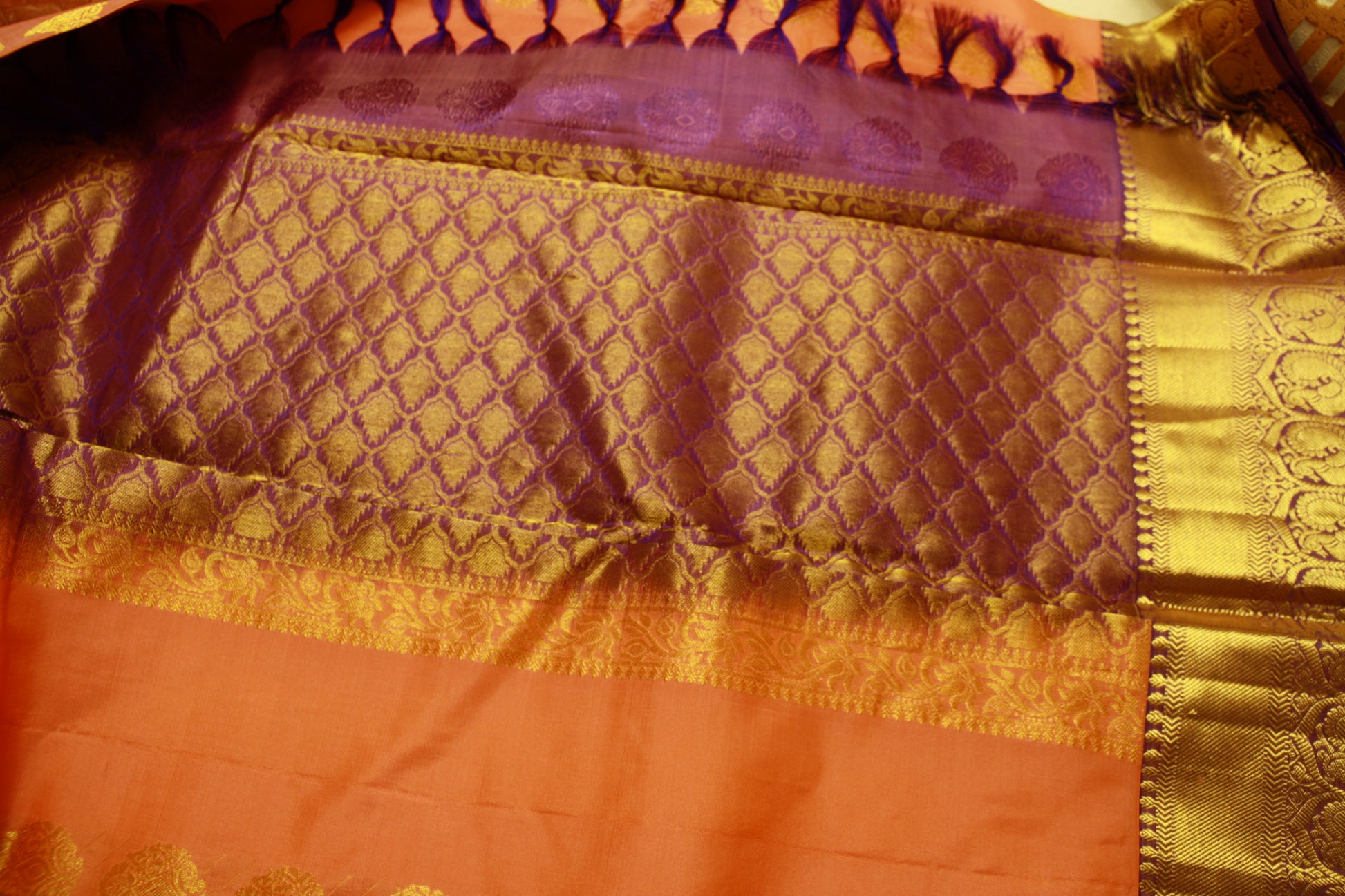 Apricot Blush Color Pure Silk Kanjeevaram Handloom Lightweight Saree Peacock Purple and Golden Zari Pallu | SilkMarkCert