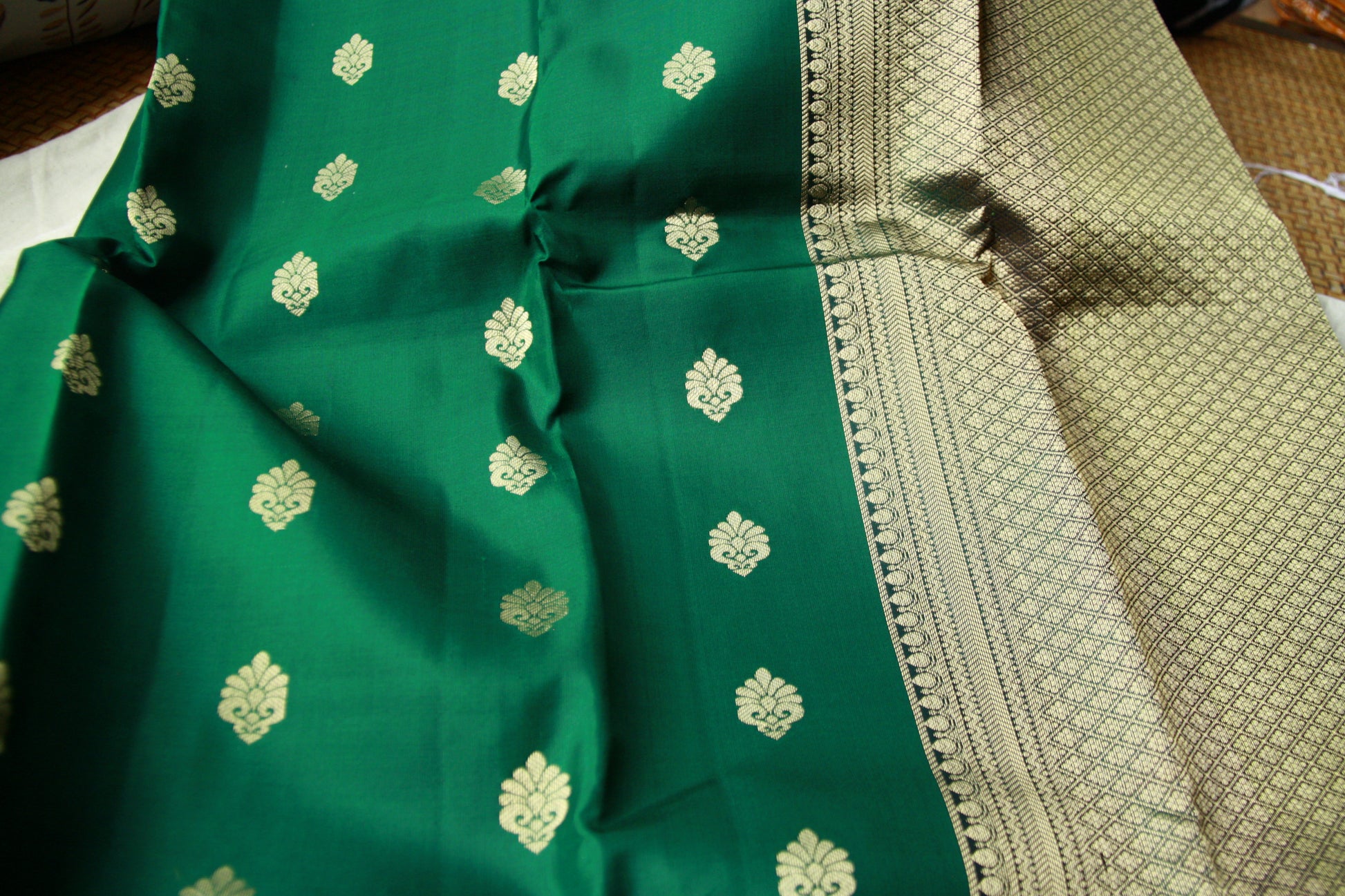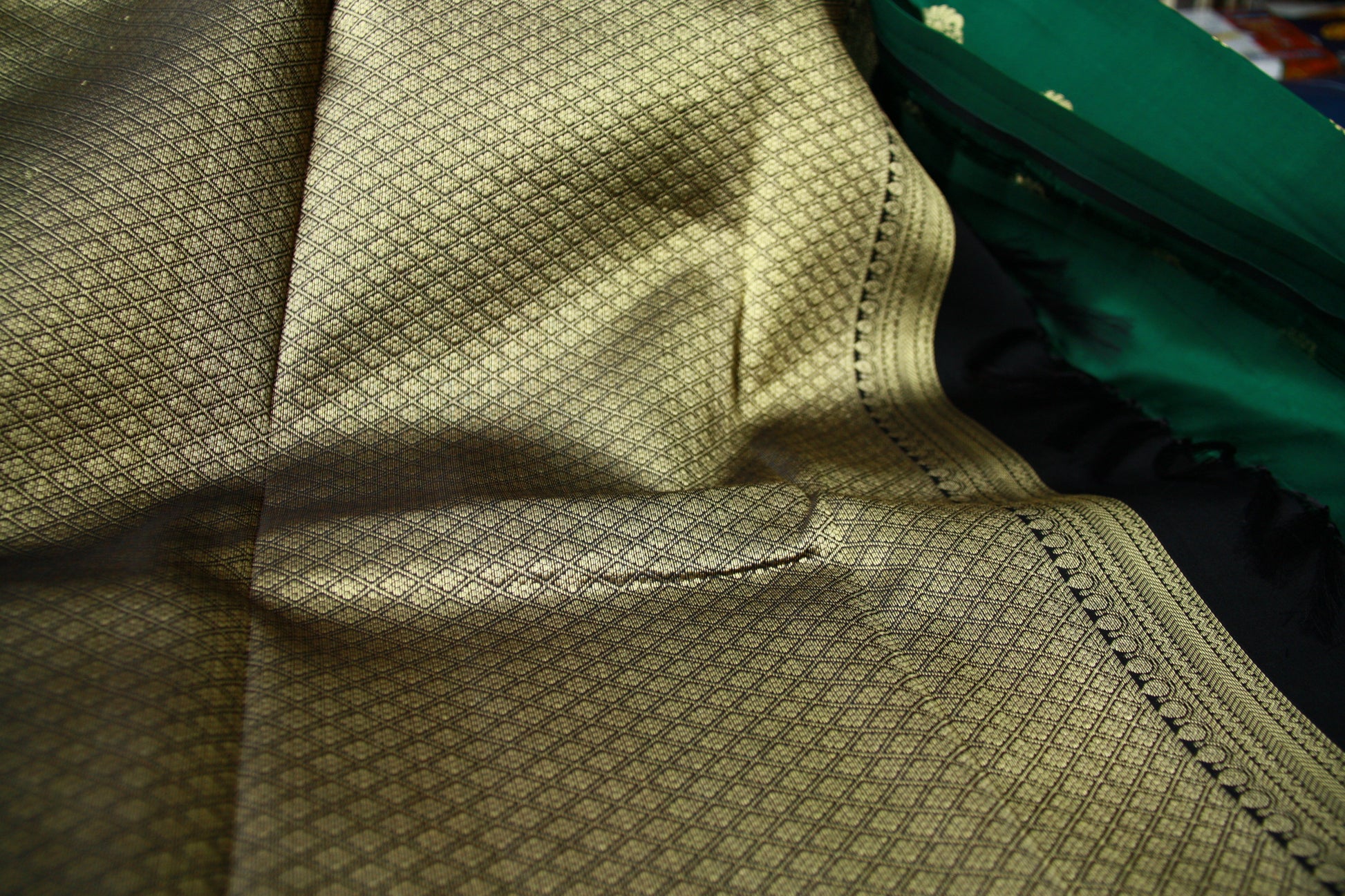 Bottle Green Color Pure Silk Lightweight Kanjeevaram Saree with contrast Black Golden Zari Pallu | Silk Mark Cert
