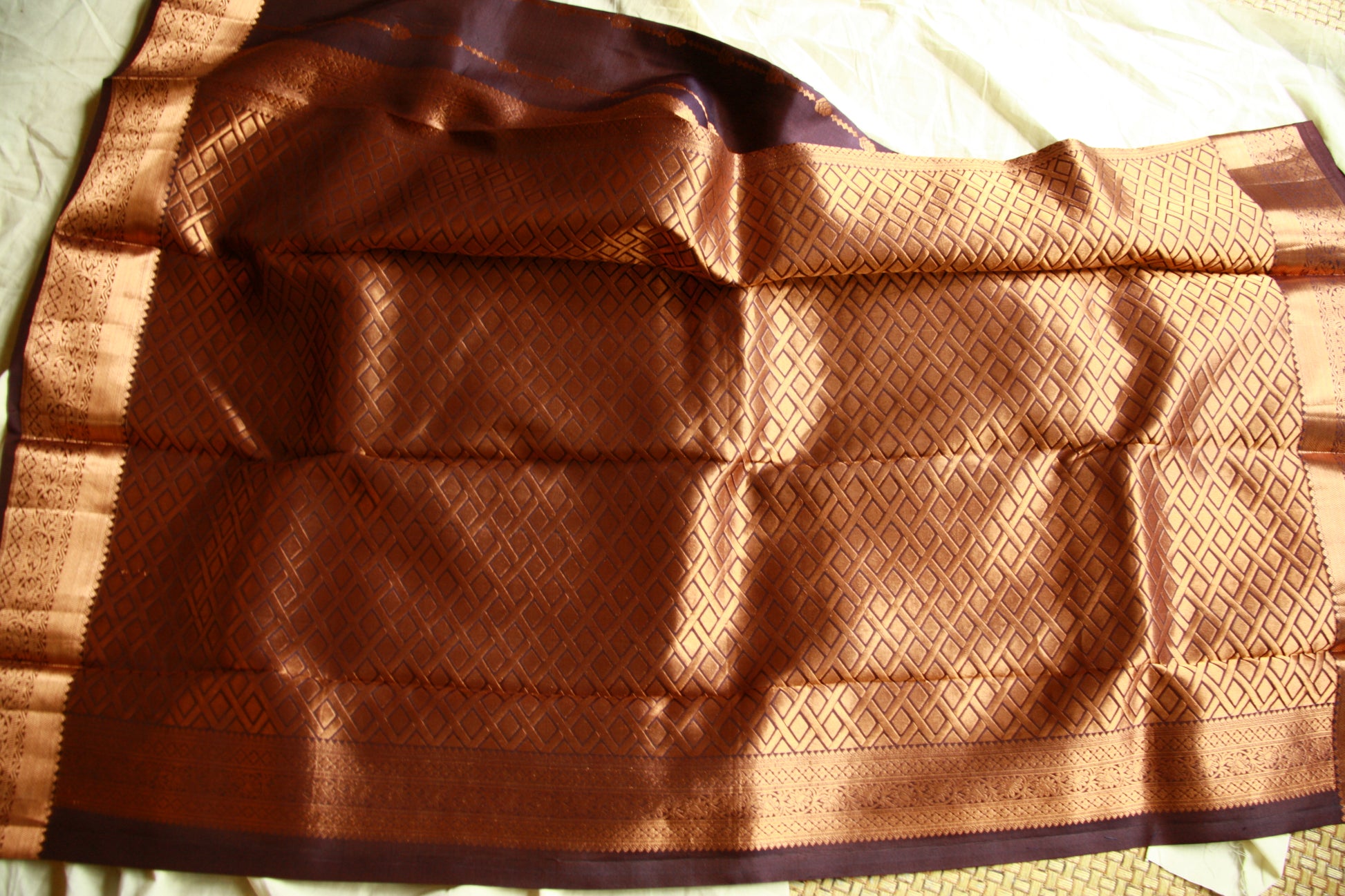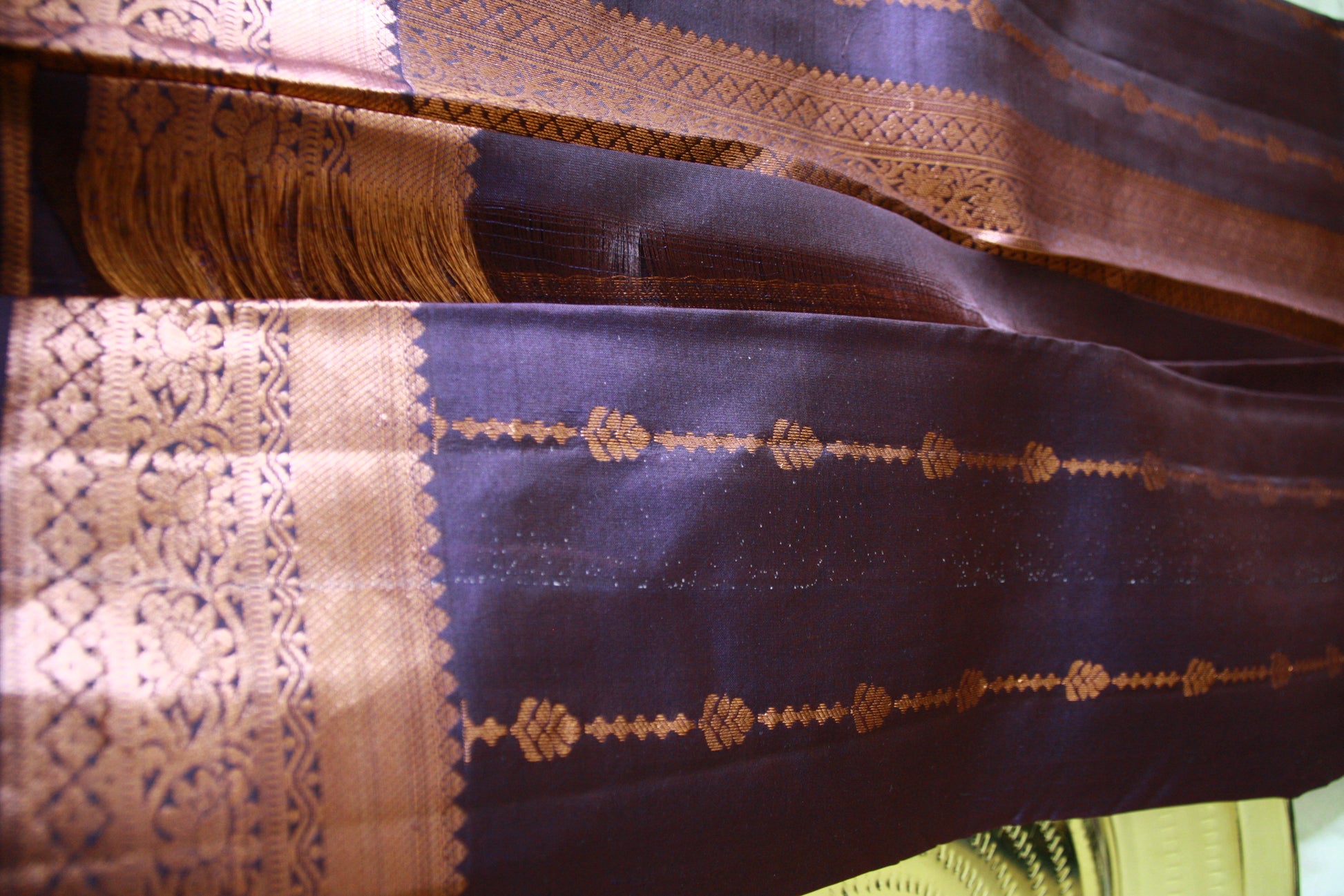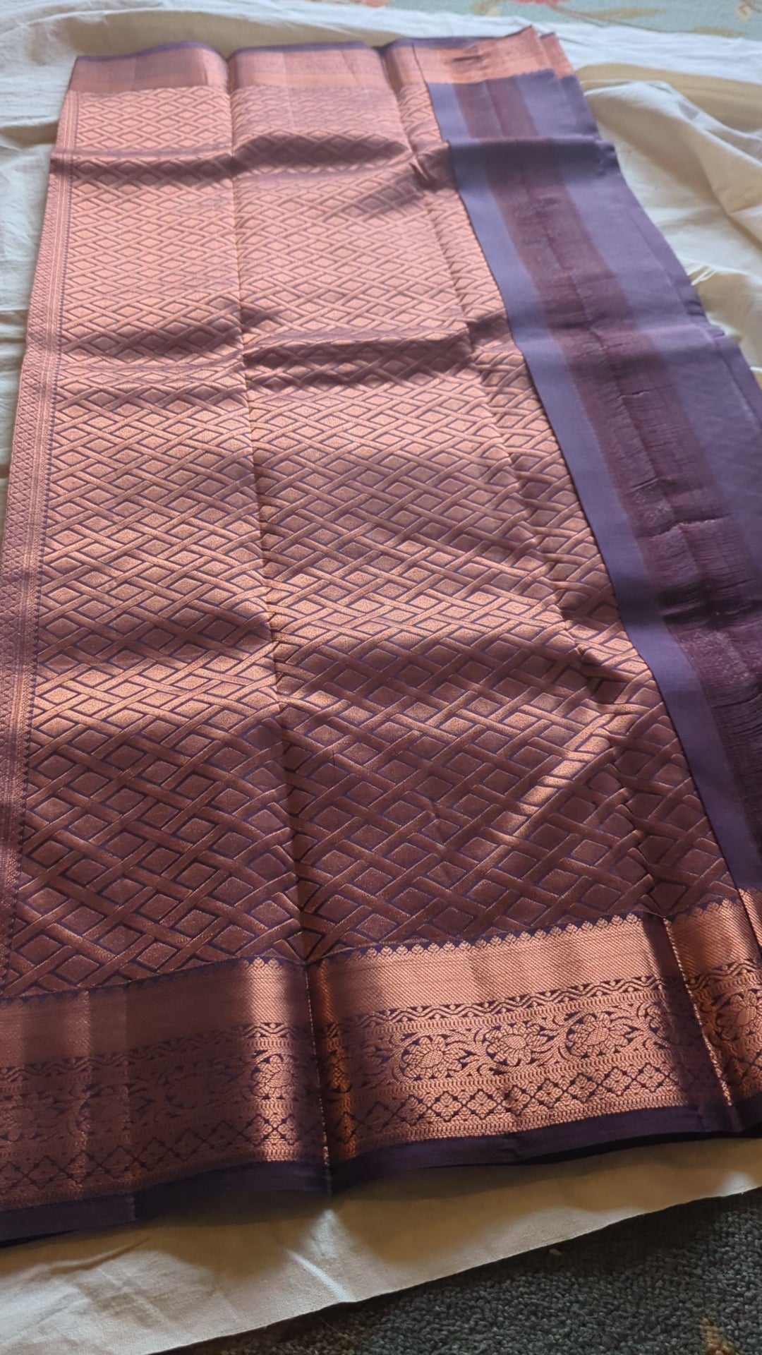 A rare color and perfect contrast of Deep Purple and a Dark Copper Zari. Pallu work is absolutely stunning with geometric pattern.