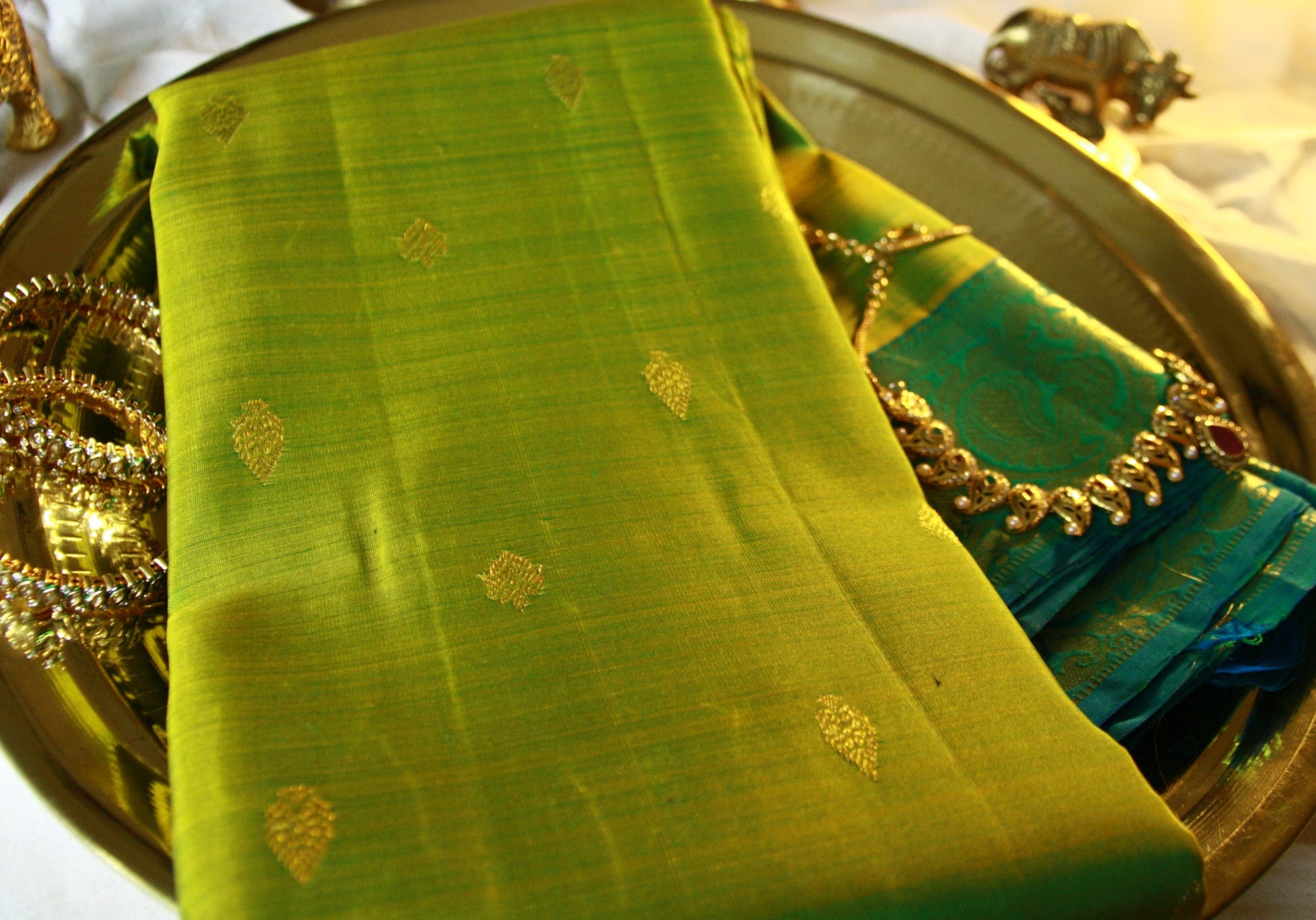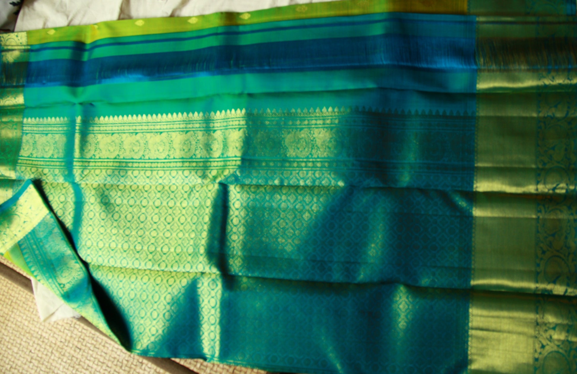 Green Pure Silk Kanjivaram Saree with Blue and Golden Zari work | SILK MARK CERTIFIED