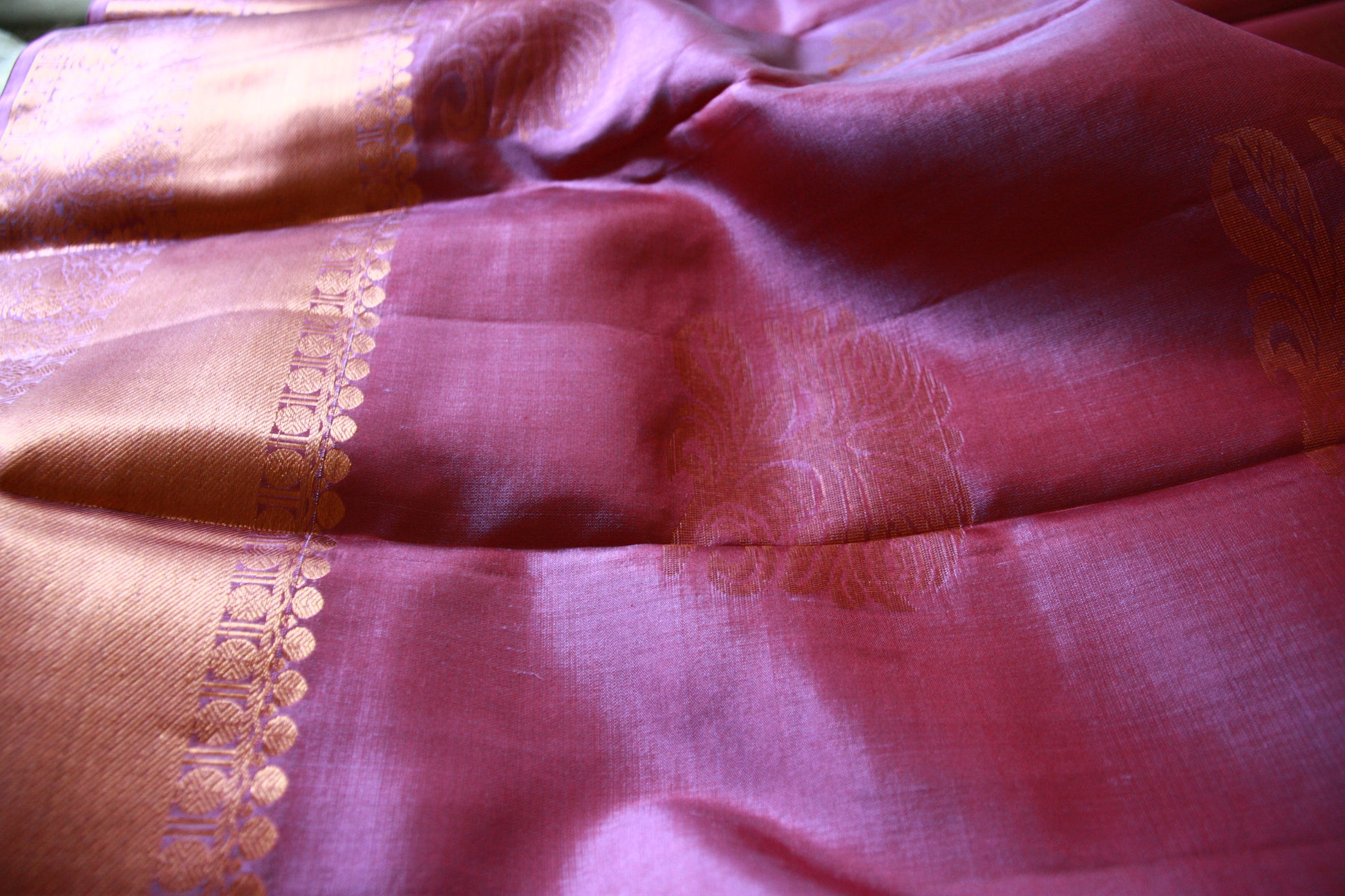 What happens when we mix Lilac with deep pink? You get a rare gorgeous color Saree with beautiful Golden Zari border and Pallu!
