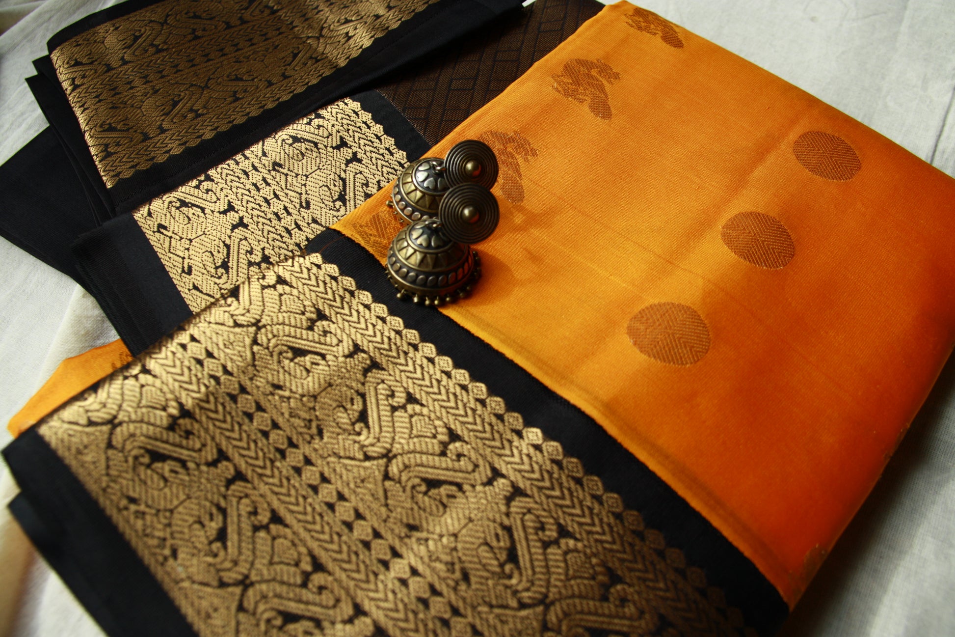 Mango Yellow Color Pure Silk Lightweight Kanjeevaram Saree peakcock motifs with contrast Black Golden Zari Pallu | Silk Mark Cert