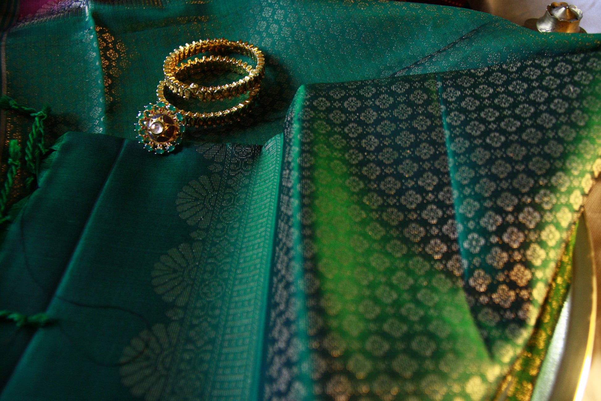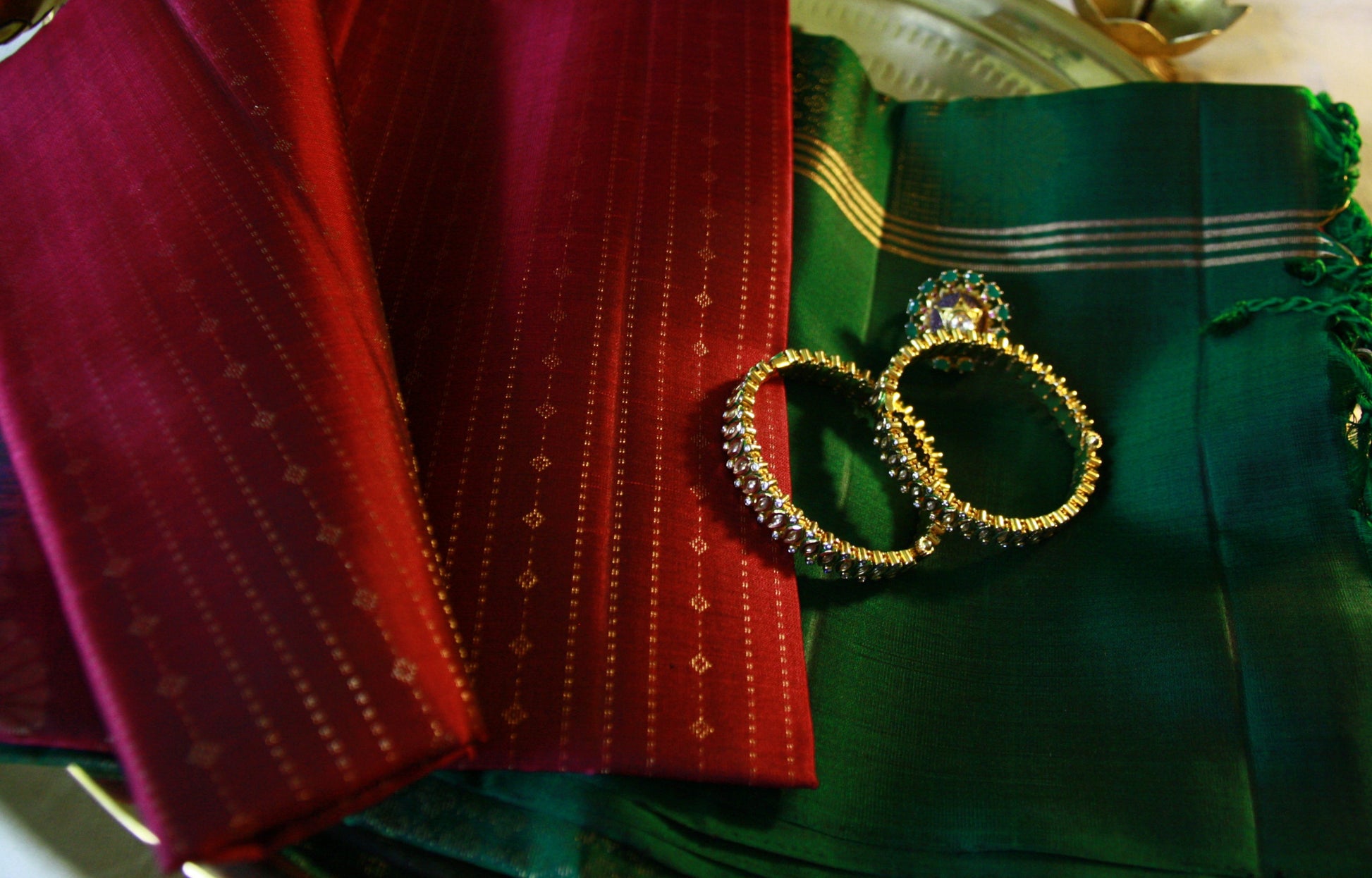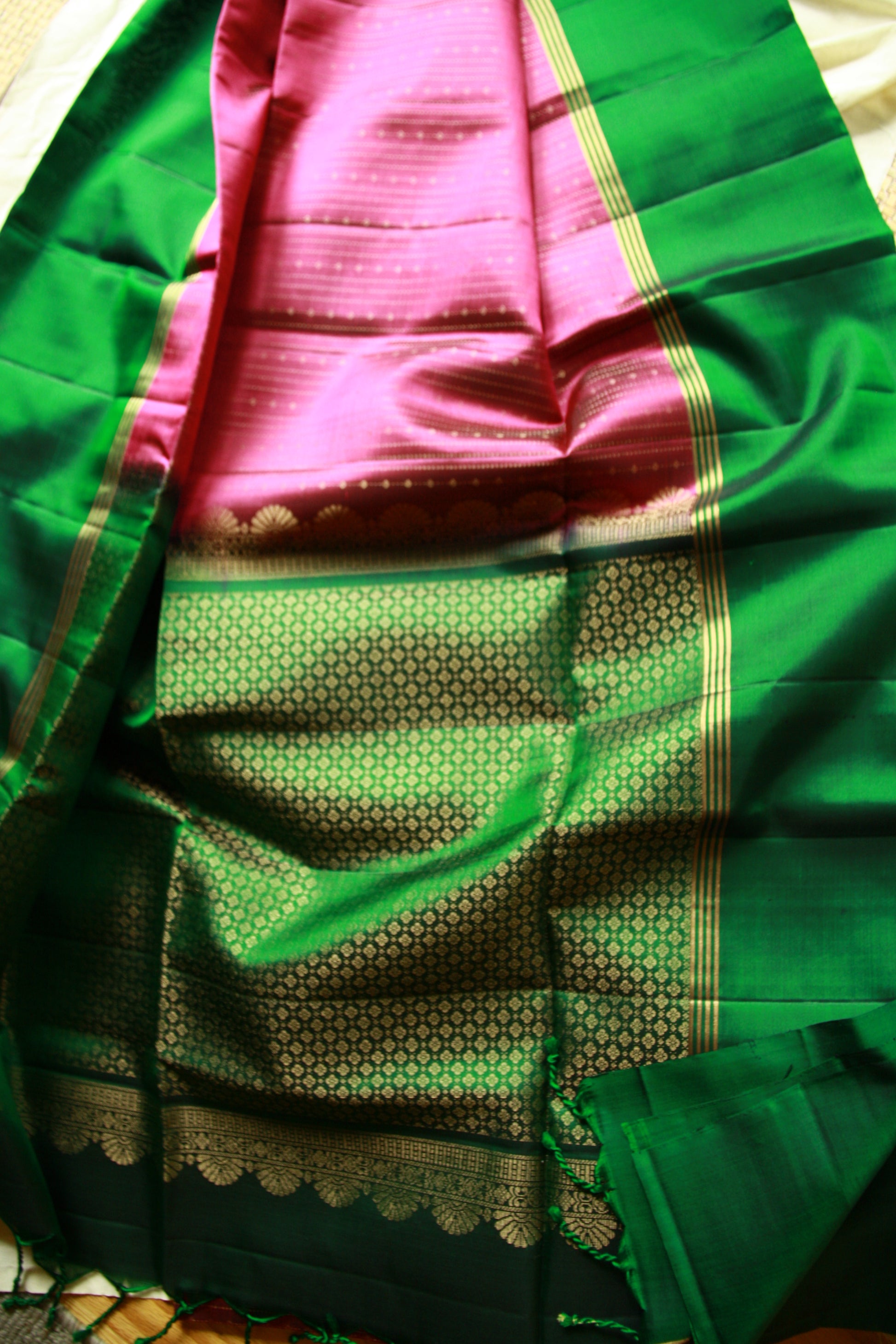 A lightweight on the go dress up saree with beautiful rain drop like motif work through the saree. The absolutely stunning Dark Green Golden Zari border contrasting with the Maroon Pink color of the saree. ~~blouse piece attached~~~