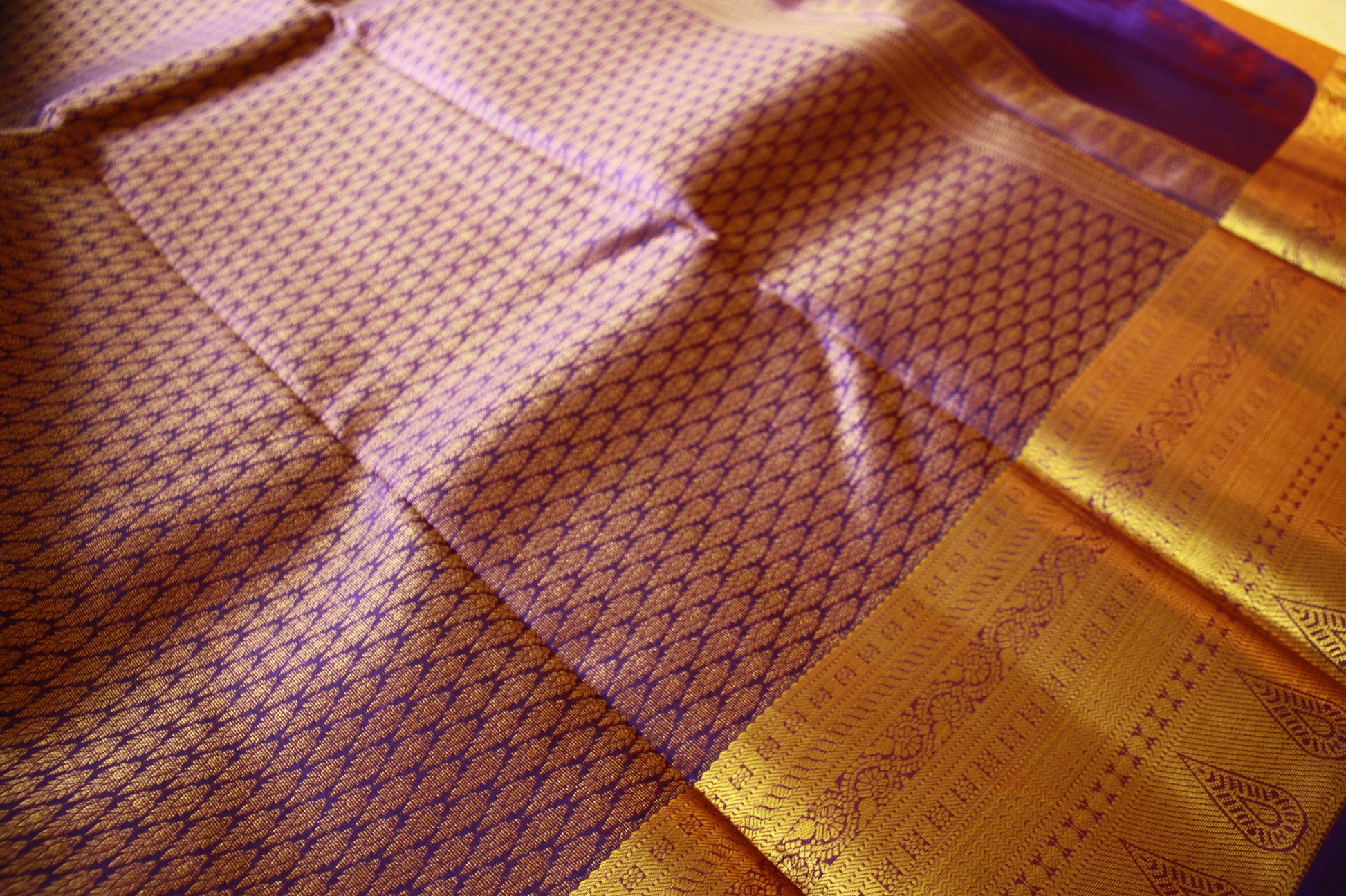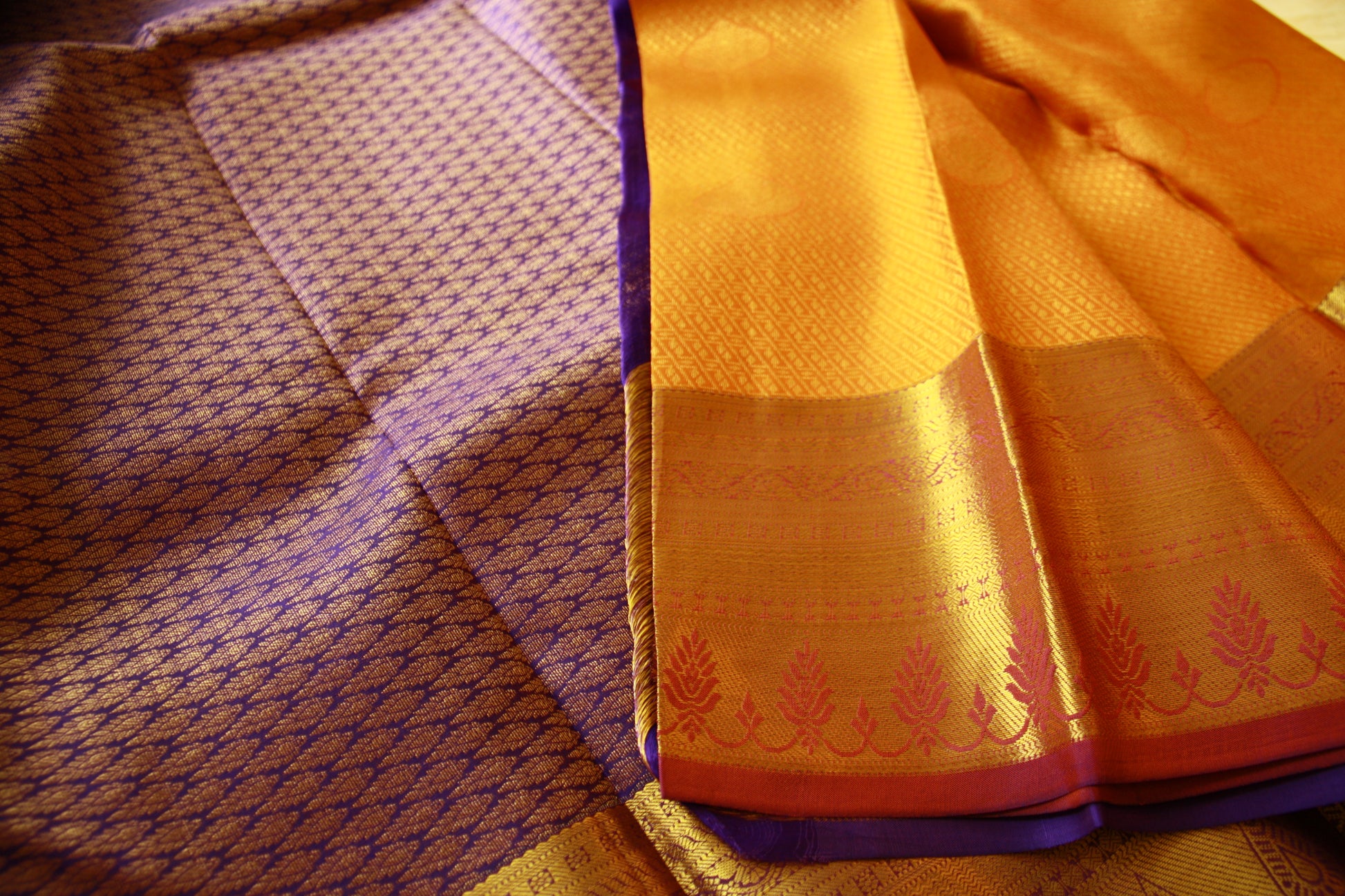Orange Yellow Shade Pure Silk Kanjivaram Saree with Purple Golden Zari| SILK MARK CERTIFIED