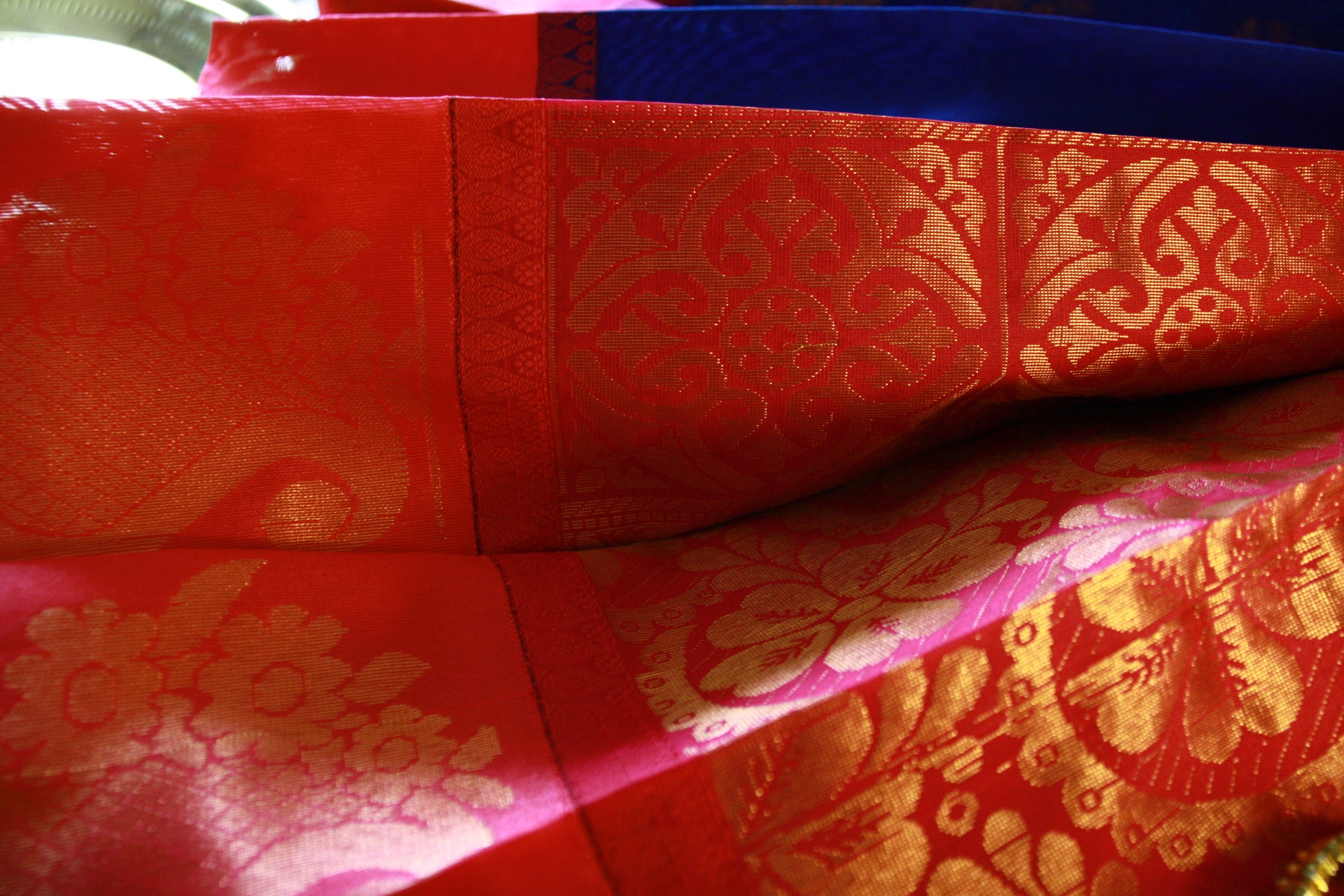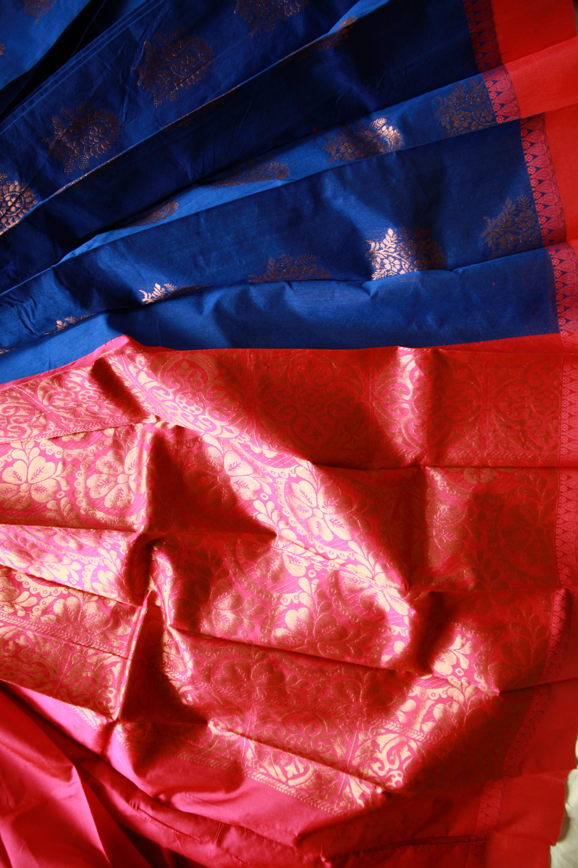 A combination of Peacock Blue and Rose Pink. What makes this Saree stand out apart from these vibrant colors are the gorgeous Rich Golden Zari work in the Pallu!