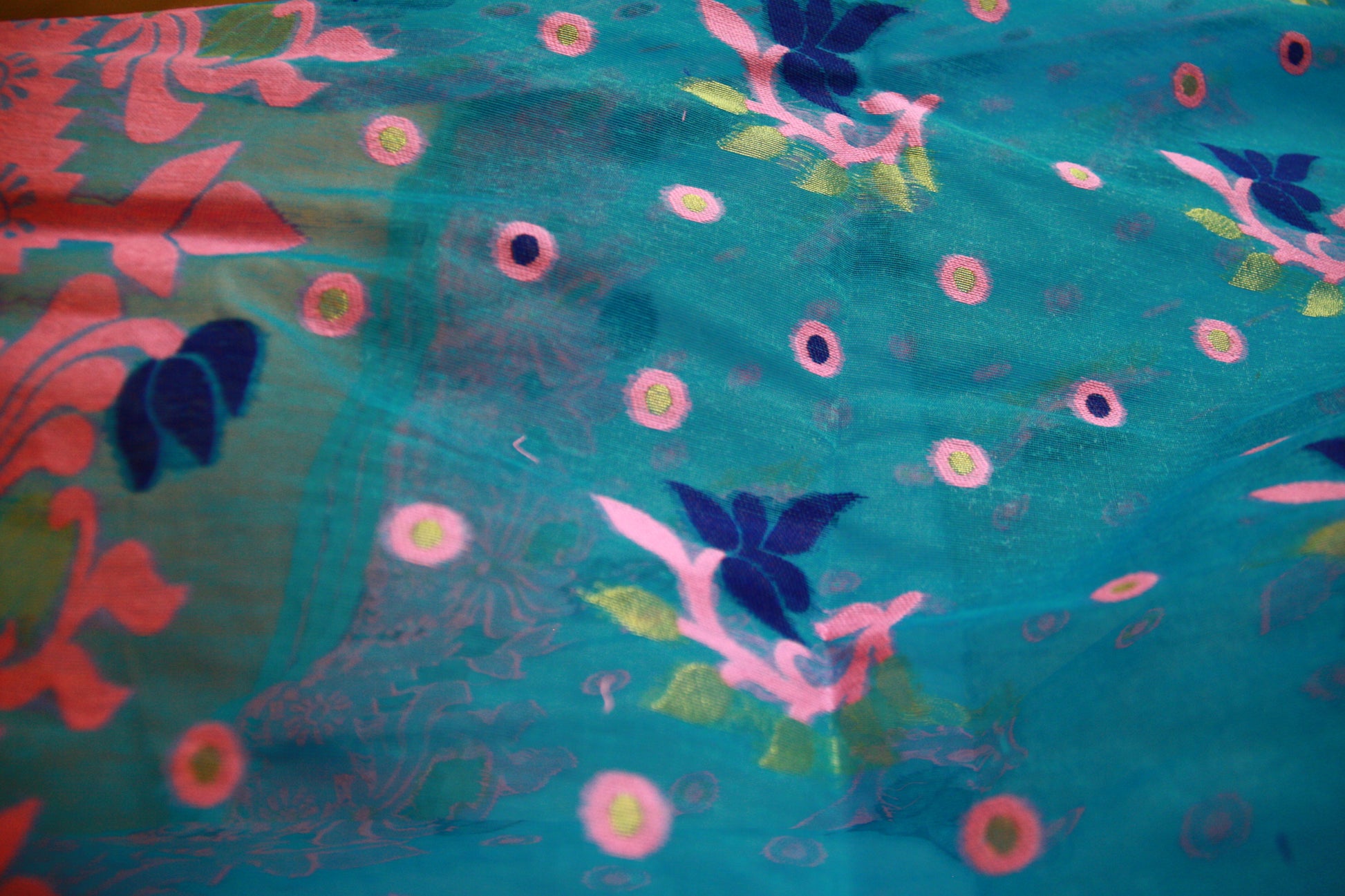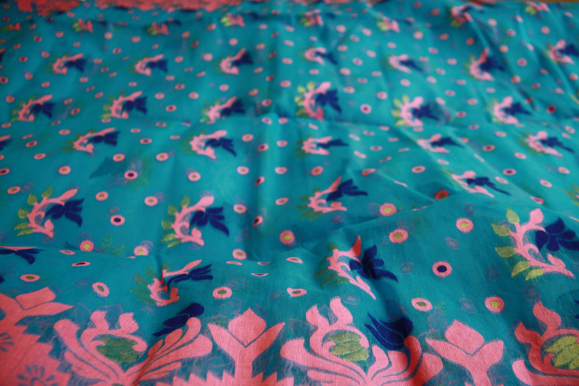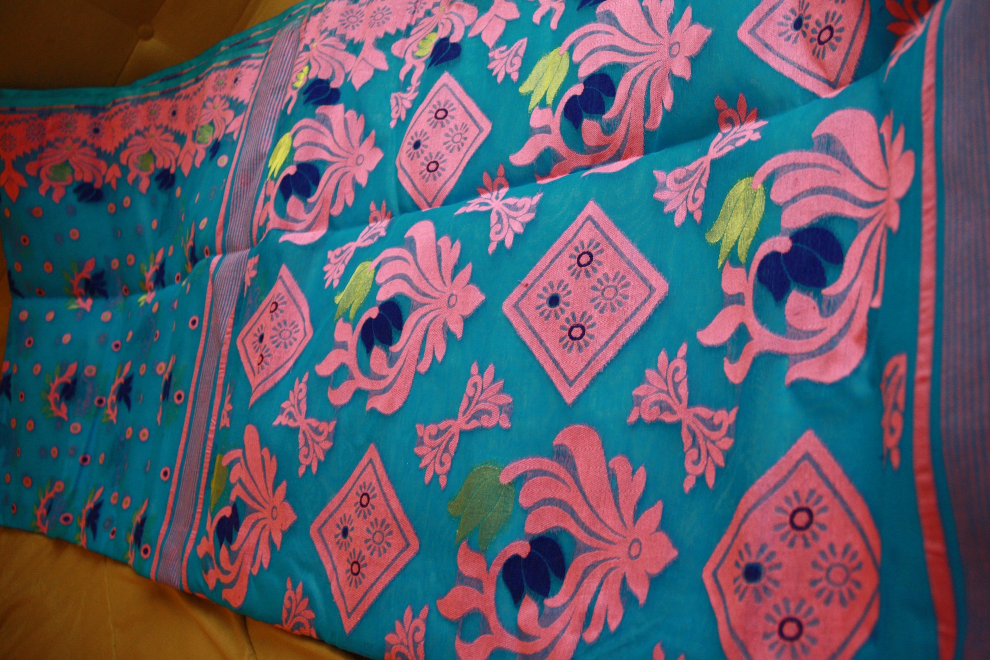 Pink Handwoven Thread work on Blue Saree | Bengali Jamdani Saree Pure Cotton