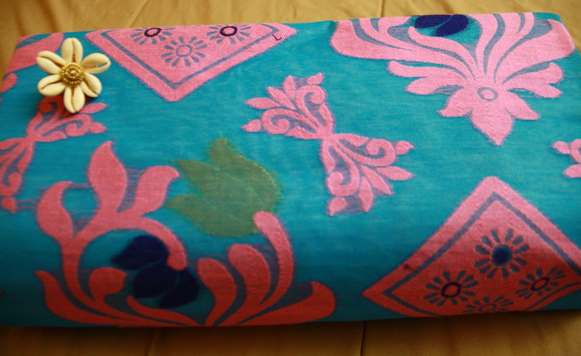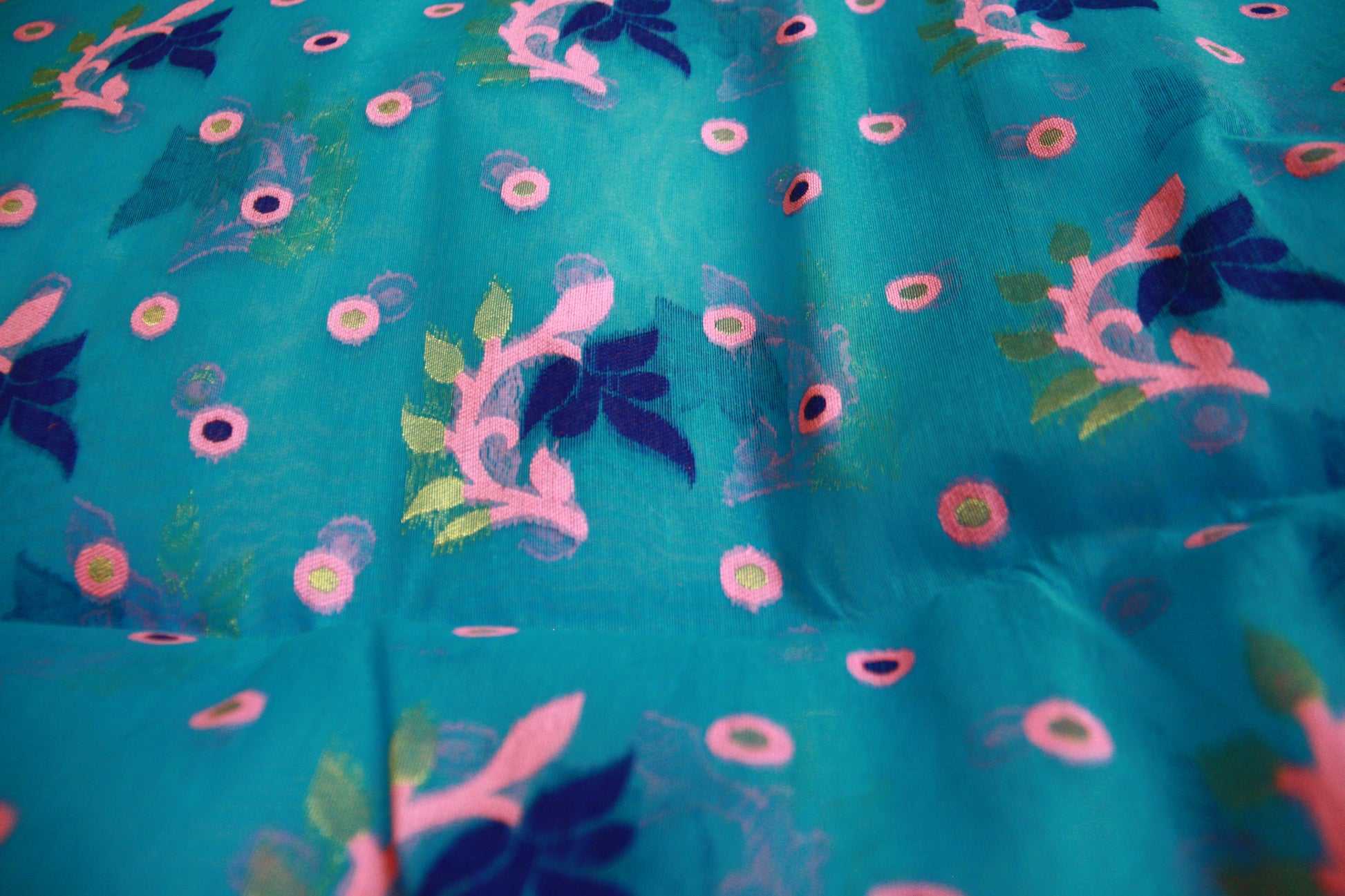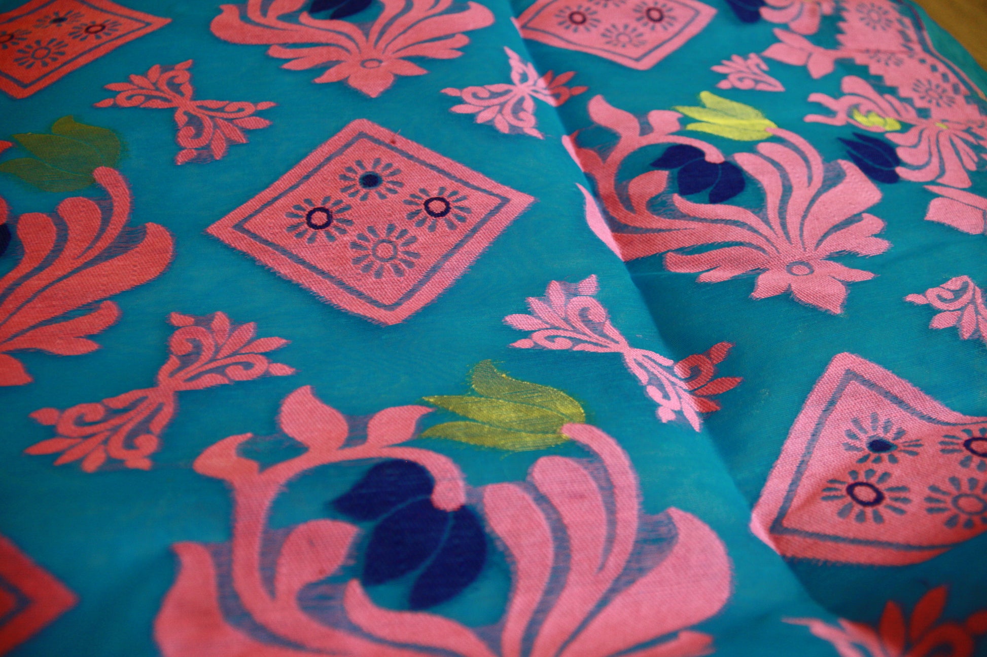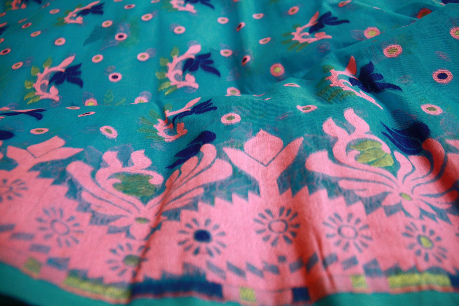Pink Handwoven Thread work on Blue Saree | Bengali Jamdani Saree Pure Cotton