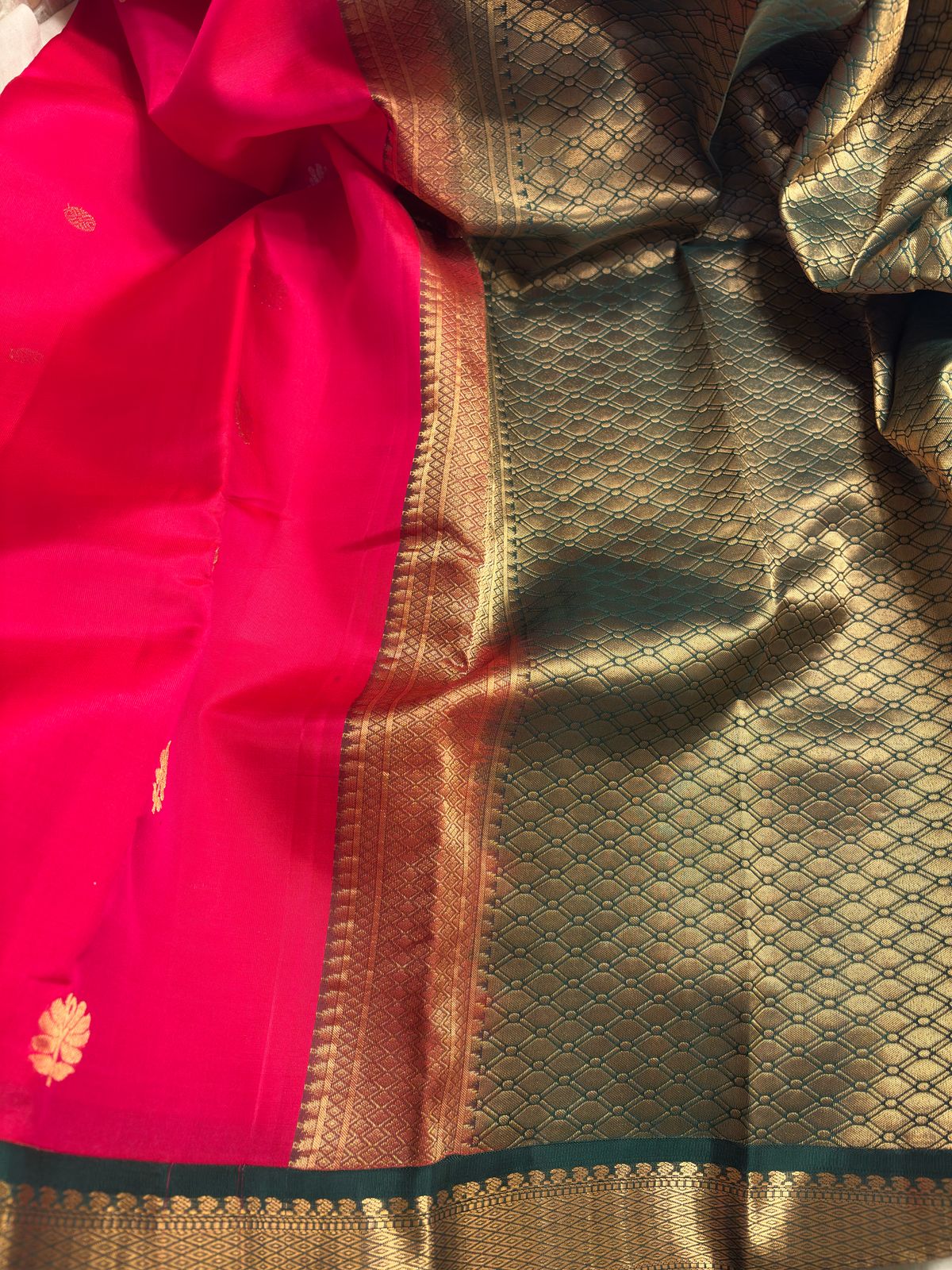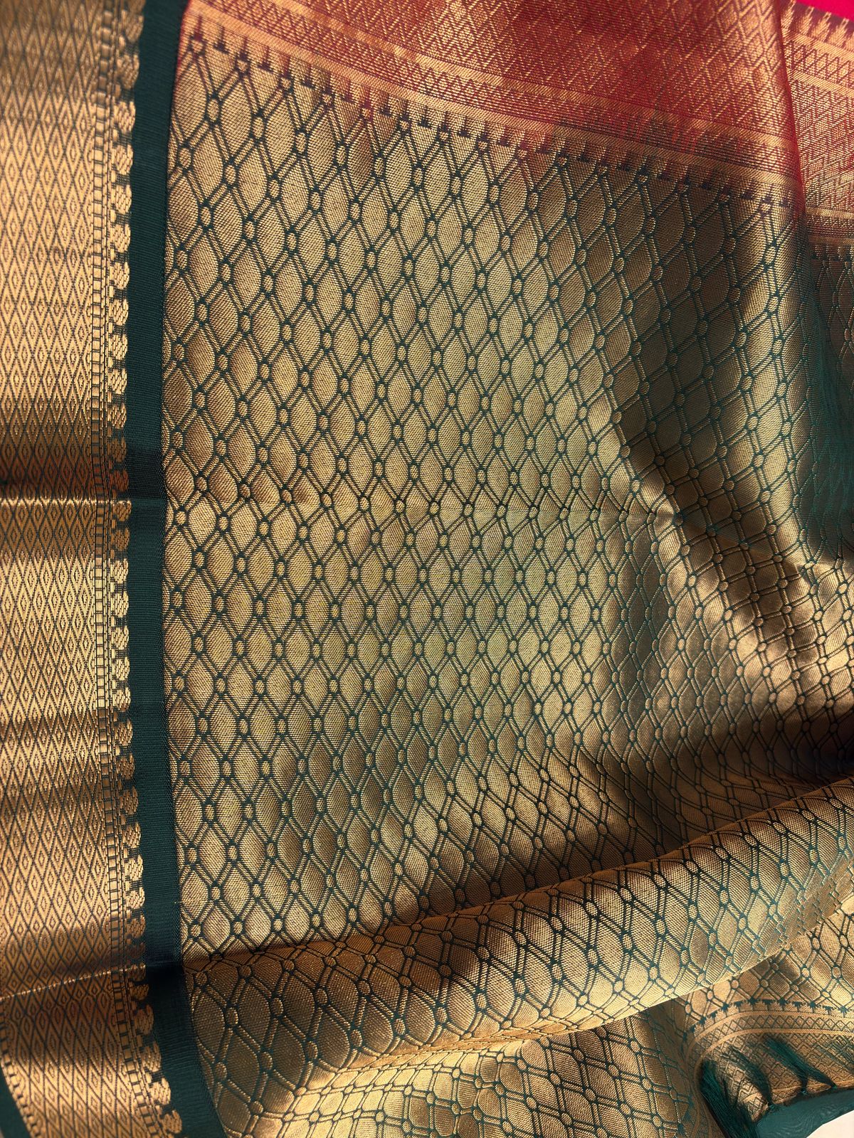 Pinkish Red Color Pure Silk Kanjeevaram Lightweight Saree with contrast Dark Green Golden Zari Pallu | Silk Mark Cert
