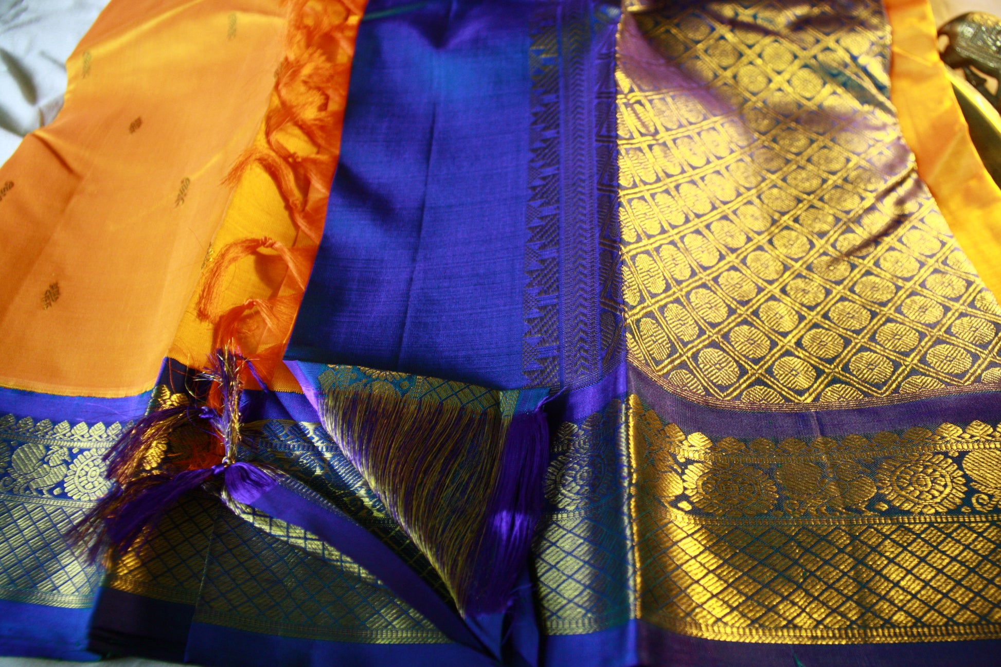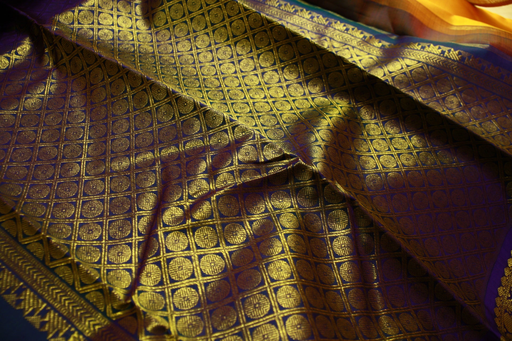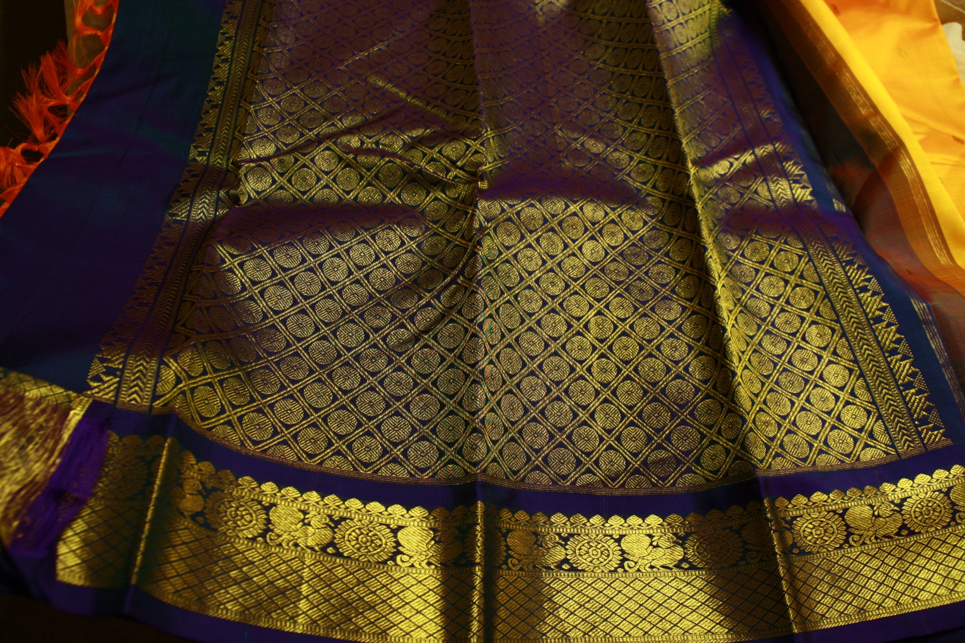 Orange Yellow Pure Silk Kanjivaram Saree with Golden Zari work | SILK MARK CERTIFIED
