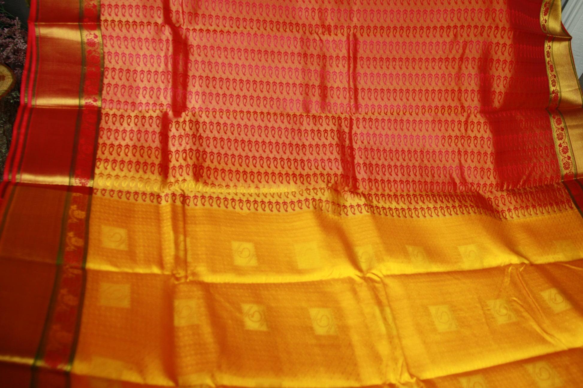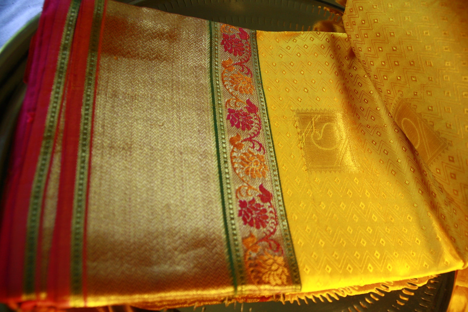 Vibrant Yellow Pure Silk Kanjivaram Saree with Pink and Golden Zari work. | SILK MARK CERTIFIED